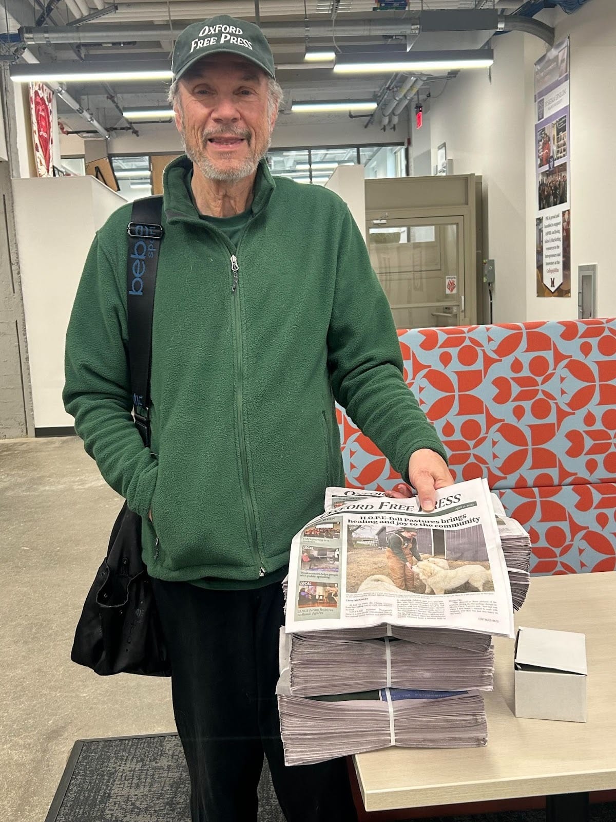 For our latest “5 Questions with” feature, we caught up with Richard Campbell, the founding chair of the Media, Journalism, and Film Department at Miami University, who co-founded the Oxford Free Press. The Free Press is a nonprofit newsroom that launched last June to cover the town of Oxford, Ohio, along with the surrounding rural areas and the Talawanda School District. Richard is now the board secretary and writes a regular opinion column for the paper. He also helps deliver the paper to the Miami campus on Fridays (see image above).