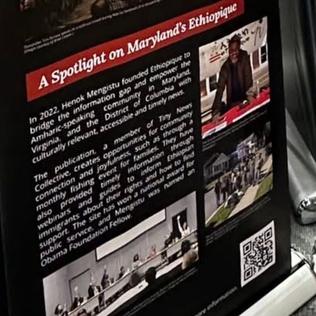 🖼️ Ethiopique and founder Henok Mengistu are featured in a special traveling exhibit (see above photo) on the freedom of the press created by Maryland Humanities to commemorate the 250th anniversary of the Declaration of Independence. As a partner in the project, TNC contributed to the section of the exhibit about reimagining local news. Henok was also recently featured by Press Forward in a “Local News Leader Spotlight.”